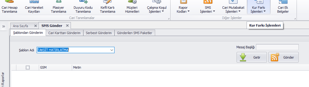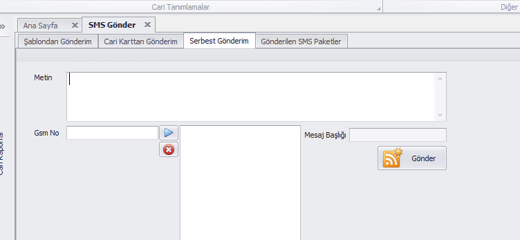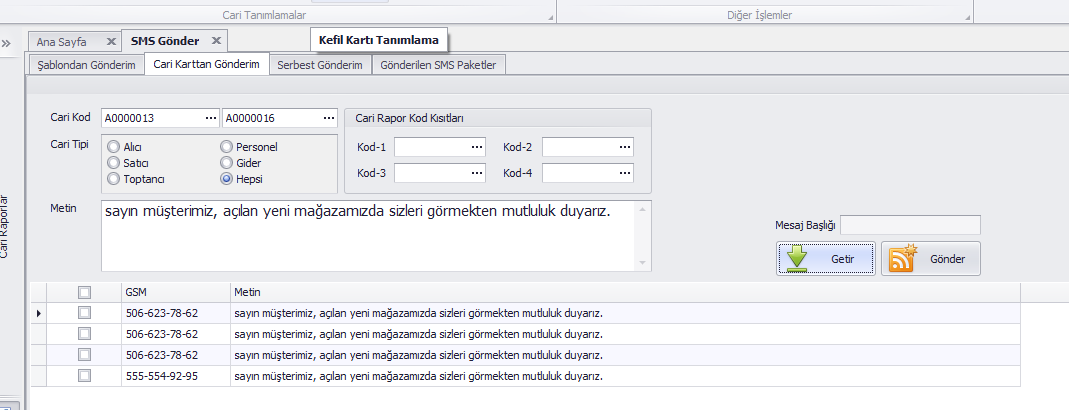 Cari Karttan Gönderim: Rehberler yardımı ile cariler seçilir, metin bölümüne serbest bir sms metni girilir. Getir butonu ile listelenir, Gönder butonu ile sms gönderimi yapılır.